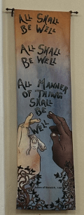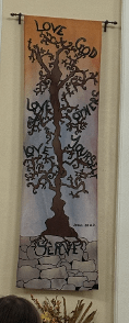 To the right, a piano sits where the music director plays and directs the songs sung throughout the service. In the center of the room up front, a podium resides on a small stage where Reverend Sara delivers her sermons. Few decorations adorn the walls, but on the right wall hangs a quilt with a visual of the four different seasons on it. On each side of the stage, banners hang with the world map on display. These banners were changed out sometime in October for different banners that had more of a Fall vibe to them. The one on the left of the stage was a tree with the words “love God, love others, love yourself” between the branches and “serve” under the roots. The one on the right got traded out for a picture of two hands reaching up to the words “all shall be well, all shall be well, all manner of thing shall be well.”