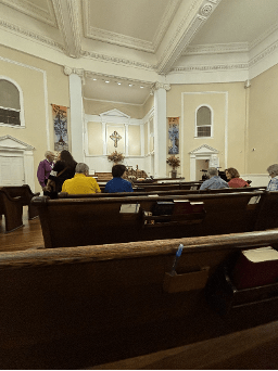 Inside, the building feels calm from the light yellow walls, highlighted by white trim and wooden flooring. A chandelier hangs in the middle of the room and four columns of pews with about six rows each, one in the center, two on either side of that, and a smaller section farthest left. At the front of the sanctuary, the church has dedicated an area for families through the use of a small table where children play. The program features a note to reserve that small left section for people with children. You can also sit upstairs, but we never saw up there as most people do not choose to do so.