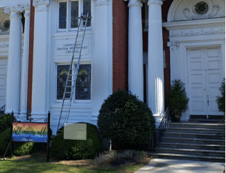 Centenary sits right on the edge of Mercer University’s campus and Tattnall Square Park. The church owns and uses multiple buildings for their offices, the fellowship hall, the sanctuary, and the Wesley house, a Mercer University organization associated with Centenary. Behind the office building sits a parking lot for church members to use during Sunday service, but many people parallel park out front and along Tattnall Square Park instead. A rainbow sign sits outside that reads “all means all. really.” allowing you to see a glimpse into their values before ever walking in. The sanctuary is an older building, utilizing red bricks and white columns and arches for the structure, with a tall bell tower in the center. A few stained glass windows line the outside of the building. They are decently sized, but sparsely spread.
