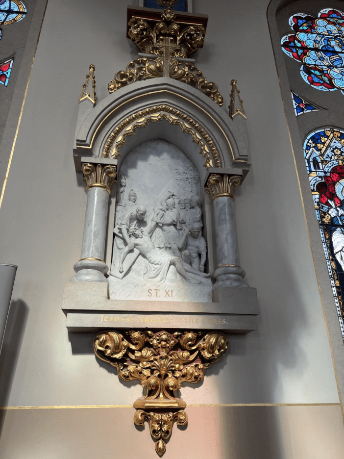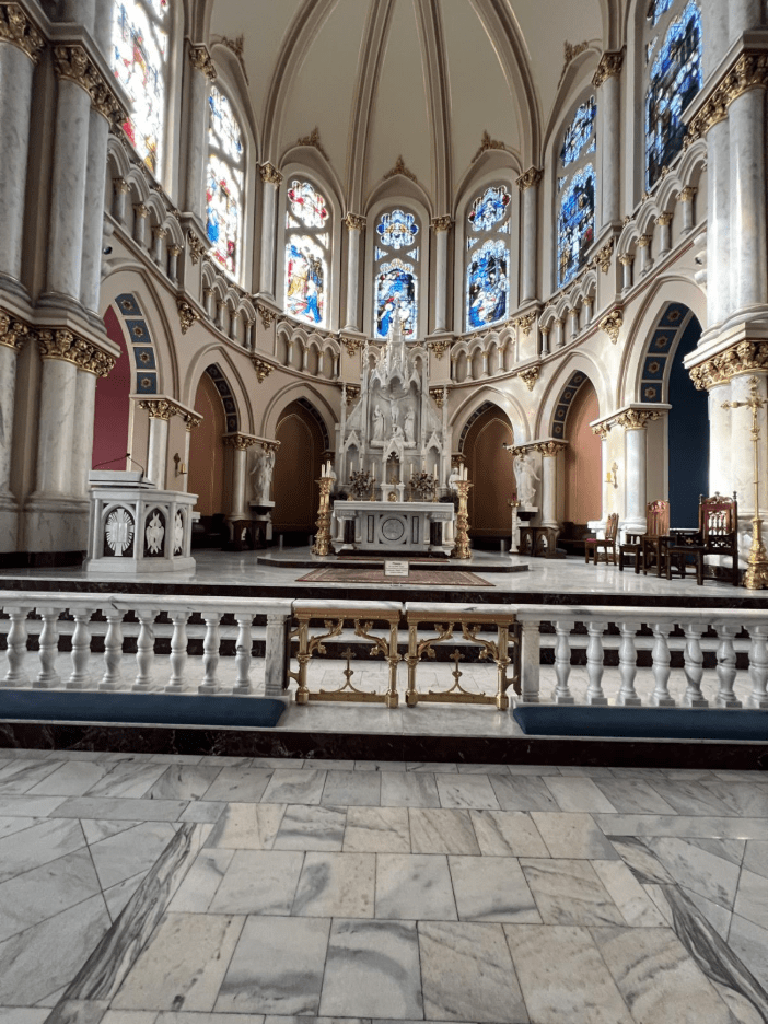 The history of St. Joseph’s dates to 1841, when immigrants from Ireland established a small Catholic congregation in Macon. According to Ryan Burge in The American Religious Landscape, Catholicism was a minority faith rising within Georgia but also in the country more broadly during this time. “Recall that just 2% of all religious adherents were Catholics in 1776, but by 1850, that had jumped to just over 12% and continued to rise from that point forward.” (Burge 11). The current church, which was completed in 1903, is an example of French Gothic Revival architecture, with twin spires in the front of the Church and German-imported stained glass throughout the sanctuary. Each member of our group noticed how remarkable and how well-kept the sanctuary was, regardless of the building’s age. The sanctuary also includes marble floors and a beautiful pipe organ that is positioned right above the main entrance. More than merely symbolizing devotion to tradition on their own, these physical elements express the parish’s connection to long-standing Catholic Liturgical traditions.